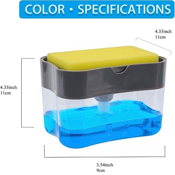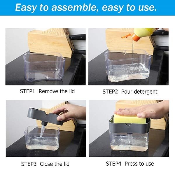 - Fill it up your favorite dish soap, then use the included sponge to press down on the pump, which dispenses the perfect amount of dish soap up onto the sponge.