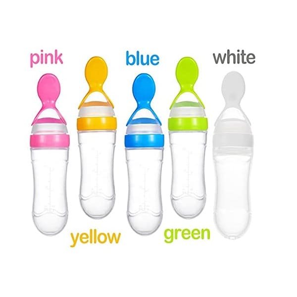 - SILICONE SQUEEZE BABY FEEDER BOTTLE WITH SPOON MAKES FEEDING A BREZZE — The Feeding Spoon with Squeezy designed for babies. Squeezable silicone baby feeder bottle with scale ensures accurate measurement, reducing spillage. Soft spoon is made of food grade silicone, helping relieve baby discomfort and massage your baby`s gums. Spoon feeder improves hand-eye coordination and fine motor skills. Suitable for rice cereal, fruit puree, vegetable puree, vegetable juice and children’s medicine.